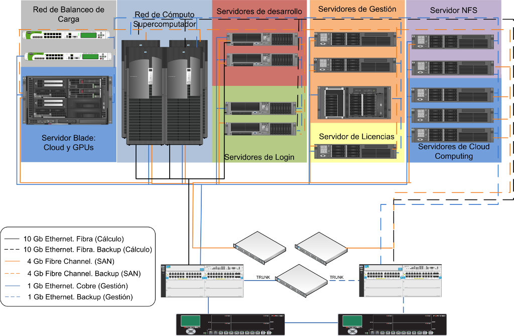 - 2 core switches HP ProCurve 5406ZL with 10Gbps switching capacity for computing network and 1Gbps interfaces for networks and users management. Both switches have 48 ethernet ports and 4 fiber channels each one.