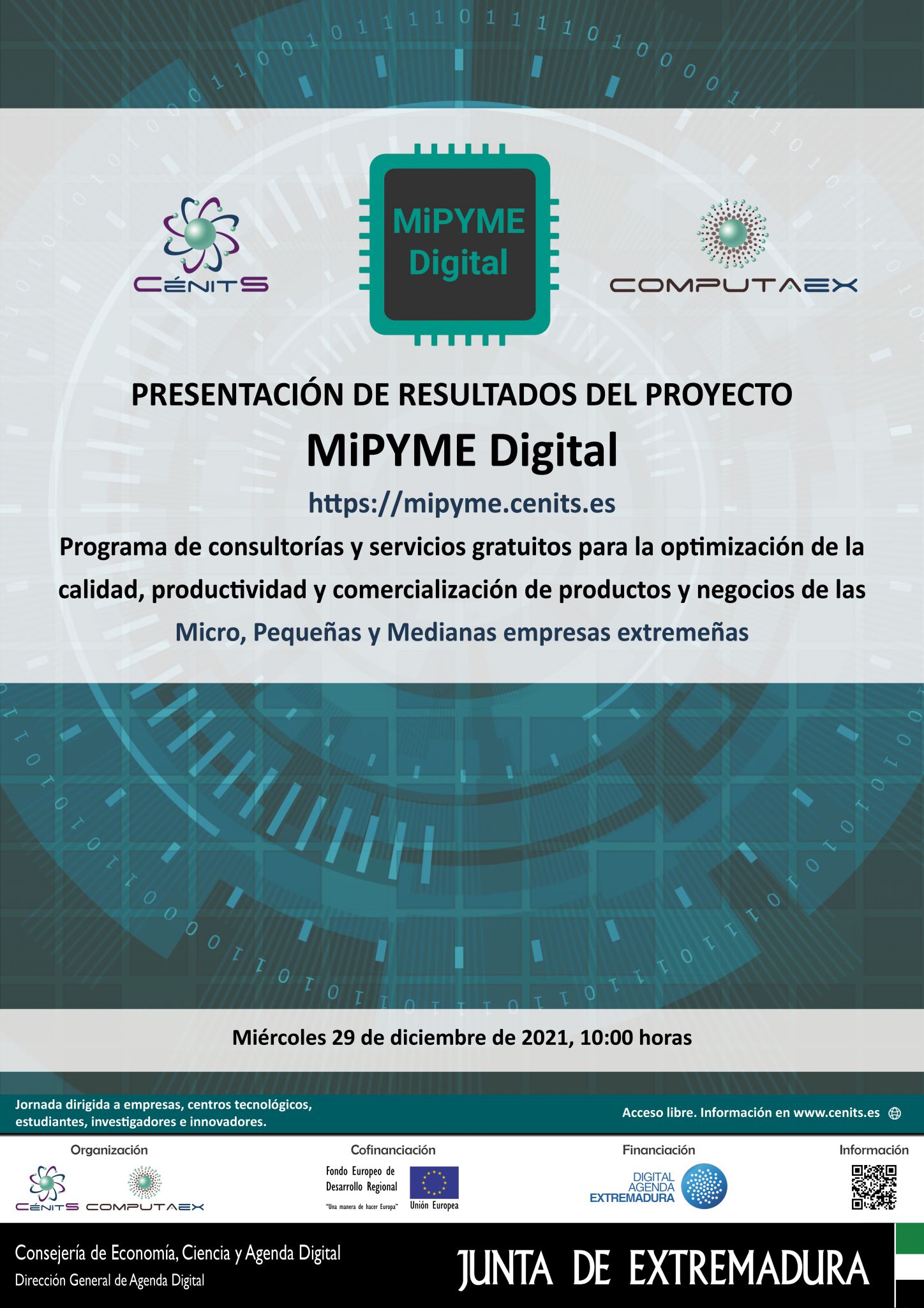La Fundación COMPUTAEX presentará el miércoles 29 de diciembre a las 10:00 horas los resultados de MiPYME (Micro, Pequeña y Mediana Empresa) Digital, con objeto de trasladar al sector empresarial extremeño los logros y la potencialidad del proyecto.